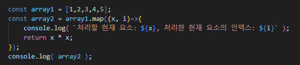 - map 메서도의 인자로 처리할 현재 요소, 처리한 현재 요소의 인덱스를 인자로 받아 처리 후 새로운 배열로 반환